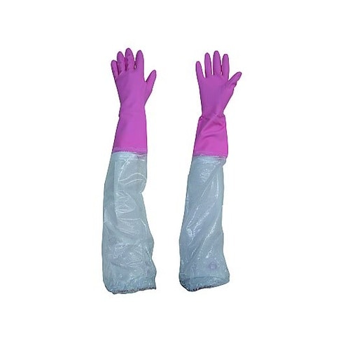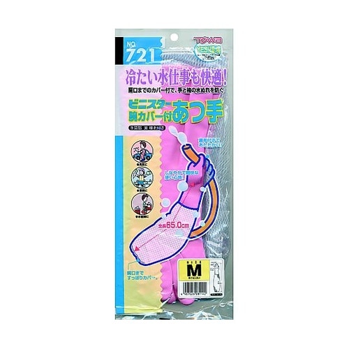 特殊溶着加工で手袋部分と腕カバーを溶着して一体化しているため、水が入らず、汚れ・水を伴う作業に適しています。塩化ビニール製のため、家庭で使われる洗剤や油に強い手袋です。耐久性のある丈夫なあつ手タイプで |