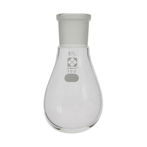 野菜のなすの形をしたフラスコです。肩の部分がないので、中の試料を取り出しやすく、洗浄がしやすい構造になっています。斜めにしたときに液の表面積が大きくなるため、口の部分が摺り合わせになったものがロータリ |