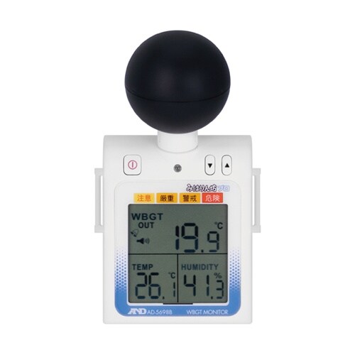 JIS B 7922:2023適合品(クラス2)です。黒球が前方向に傾斜しているので、固定物からの熱の影響を受けにくい設計です。おまかせモードで自動アラームが可能(日本生気象学会「日常生活における熱中 |