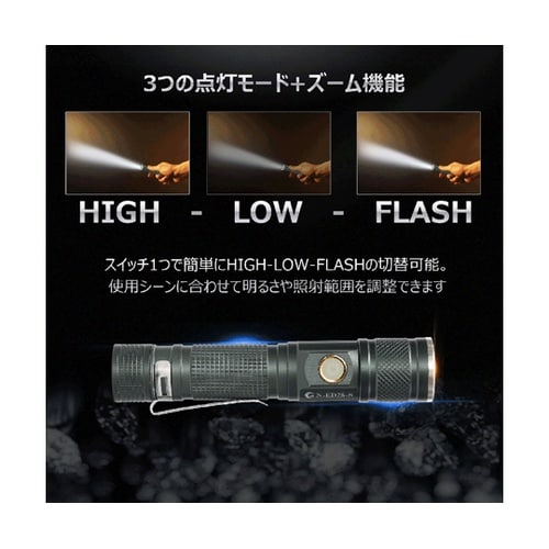 超軽量コンパクトサイズで持ち運びに便利スリムな形状で、ポケットなどにひっかけられるクリップ付き本体ヘッド部分を引っ張るだけでズーム照射に簡単切替可能スイッチ1つでHIGH−LOW−FLASHの3つの点 |