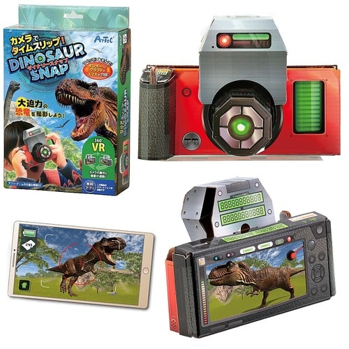 恐竜の時代にタイムスリップ!?カメラをのぞけば、キミの日常が恐竜の世界に!360度VRで、大迫力の恐竜と遭遇し、写真を撮影する商品です。ダンボールでつくったカメラ型のクラフトと、スマホアプリを連動させ |