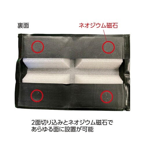 マグネットで取り付けるだけの簡単設置です。反射シールで視認性も抜群です。L字や曲面でも貼り付け可能です。2面切り込みとネオジウム磁石であらゆる面に設置可能です。 |
