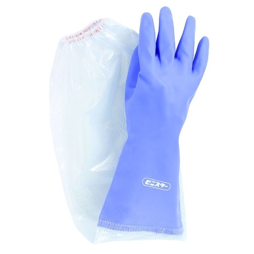 特殊溶着加工で手袋部分と腕カバーを溶着して一体化しているため、水が入らず、汚れ・水を伴う作業に適しています。塩化ビニール製のため、天然ゴムの手袋に比べて油に強い手袋です。指、手のひらにスベリ止め加工を |