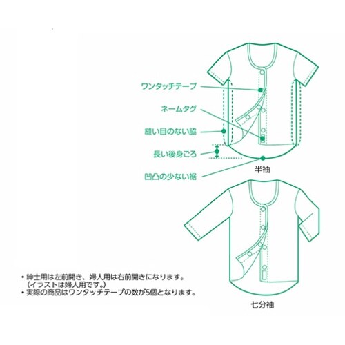 前開きタイプで着替えが簡単に行える、ワンタッチ肌着です。ワンタッチテープのため、少しの力で楽に開閉ができます。後身ごろの丈を長く設計しているため、前かがみや座った時にも背中が出にくくなっています。脇は |