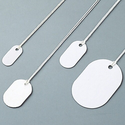様々な用途で使用されているファイバー製の白無地札です。1枚毎にヒモが付いています。 |