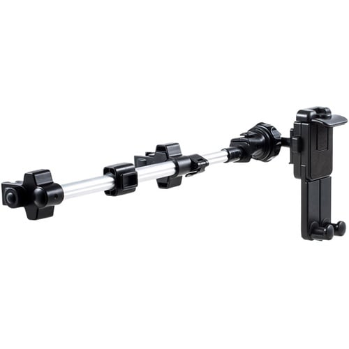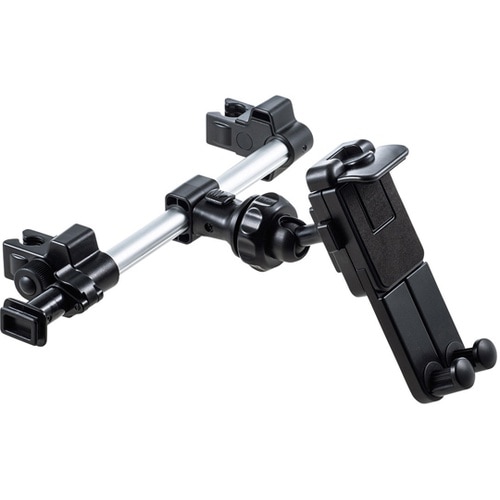 車のヘッドレストに設置できる、車載ホルダーです。7−12.9インチのタブレット・スマートフォンの幅広い機種に対応しています。機器の設置は2箇所から選択でき、座席の真後ろ、または後部座席の中央に設置する |