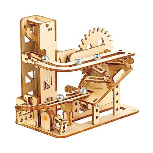 自分で組立!エレベーター式コースター!ハンドルをまわすと鉄球がエレベーターを昇ってコースターを転がる! |