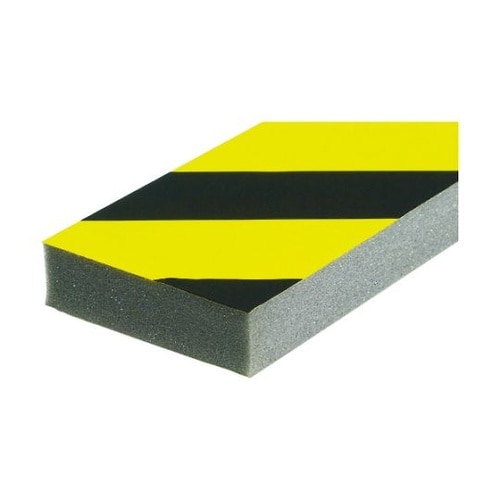 従来のトラ柄クッションより厚いため、強い衝撃も吸収します。クッション部分がソフトウレタンなので曲面にも取り付けられます。カッターで切断できます。工場や倉庫内の柱やH鋼に。フォークリフトなどの車両の保護 |