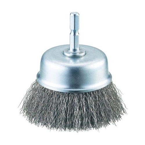 ブラシ形状がカップ型で、下面に向かって毛が植わっています。電動インパクトドライバで使用するため、ワンタッチで取り外しができます。比較的広い面の作業向きです。ステンレス線なので金属面などにサビが出にくい |