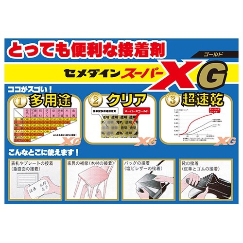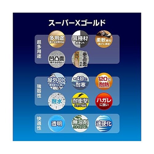 『熱・水・ショックに強い』『屋外にも使える』スーパーXの性能はそのままに、高透明度・ハイスピードを実現しました。シンナーを全く含まない環境対応型で、幅広く使える速硬化型の高性能多用途接着剤です。 |