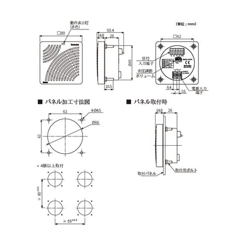 4種メロディ(救急音、巡察音、電話ベル、エリーゼのために)を提供最大95dB(1m基準)の音圧レベルを実現。前面部はIP65保護構造により湿気や粉塵の多い環境で安心してご使用可能ブザー動作時、赤色LE |