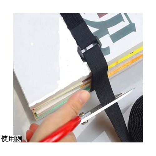 結束バンドをハサミで切断して付属のバックルで固定することができます。 |