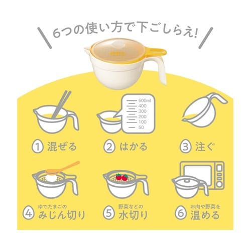 下ごしらえにちょうどいい小さめのボウル。ハンドル付で安定して調理できます。溶き卵や玉子焼きの味付け、ちょっとした混ぜ物、電子レンジにも対応。網目のストレーナーをセットして、ゆで卵のみじん切りが出来ます |