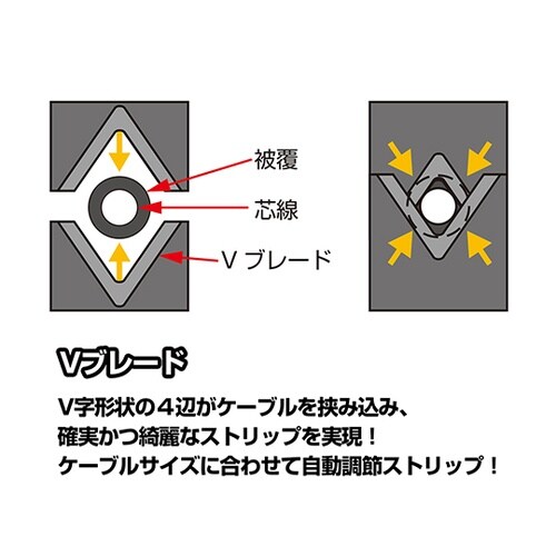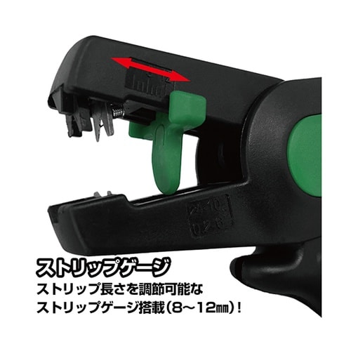 電線径自動調整機能付き。刃は耐久性に優れた高炭素鋼。本体重量125gで使用時の負担を軽減。ストリップゲージ・ワイヤーカッター付き。 |