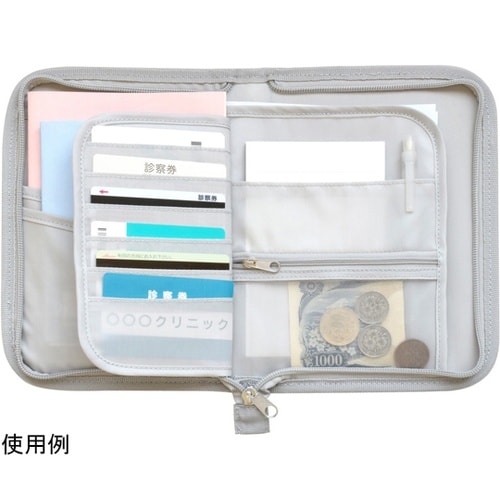 通院時に大活躍する多収納ポーチ。オープンポケットにはお薬手帳や母子(親子)手帳、ペット手帳、通帳、メモ帳などを収納する事ができ、大サイズにはペンを差す事も出来ます。家族分の診察カードがスッキリ見やすく |
