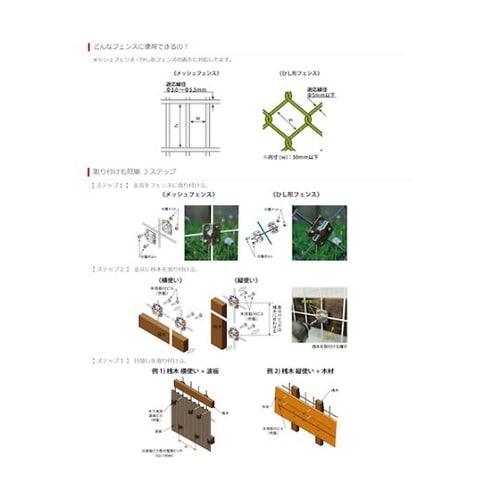 取り付け簡単なフェンス金具でプライベートな空間作りができます。木材、波板、看板を取り付けられます。浅木をヨコでもタテでも留めつけられます。外部から目隠しをしたい場合に。 |