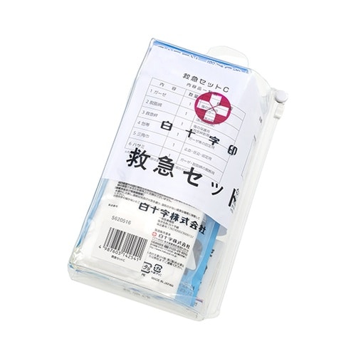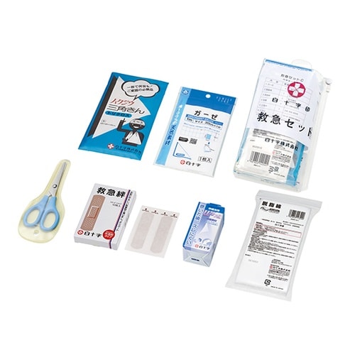 ガーゼ、脱脂綿、包帯、絆創膏、三角巾、ハサミのセット |