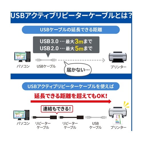 USBケーブルの規格(機器間最長ケーブル長5m)を超えて、さらに5m延長できるリピーターケーブルです。減衰したUSB信号を復元する信号増幅補正回路を内蔵することで最大5mの延長を実現しています。各OS |