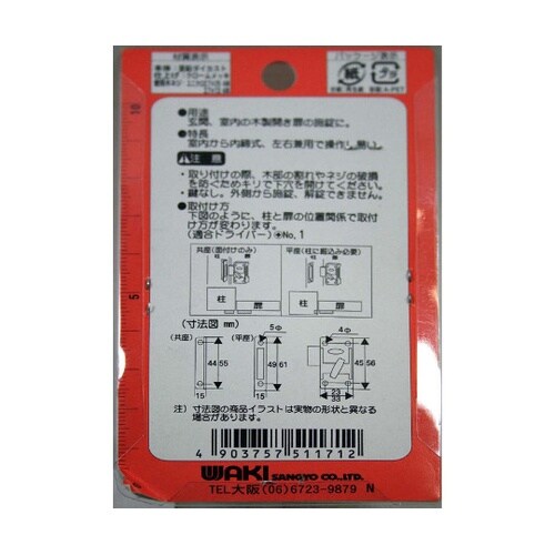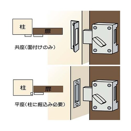玄関、室内の木製開き扉の内側からの施錠に(鍵なし)室内から内締式、左右兼用で操作し易い取り付けの際、木部の割れやネジの破損を防ぐためキリで下穴を開けてください。鍵なし。外側から施錠、解錠できません。