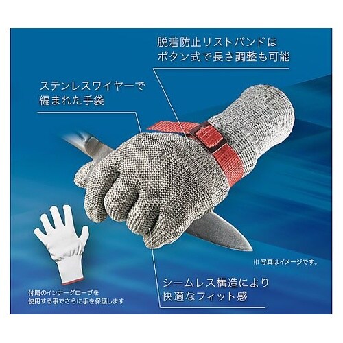 刃物から手を守る耐切創ワイヤー手袋付属のインナーグローブを使用する事で更に手を保護します脱着防止リストバンドはボタン式で長さ調整も可能農作業・剪定・園芸・木工・DIY・アウトドア・害獣駆除・切断加工・ |