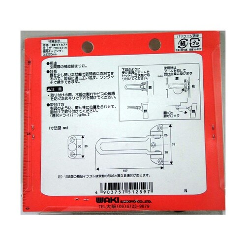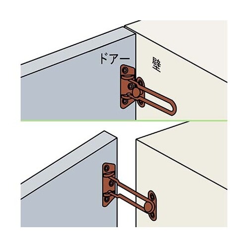 玄関扉の補助締まりに扉を少し開いた状態で訪問者に応対できるので、防犯に適していますワンタッチで操作できます取付の際、木部の割れやビスの破損を防ぐためキリで下穴を開けてください。 |