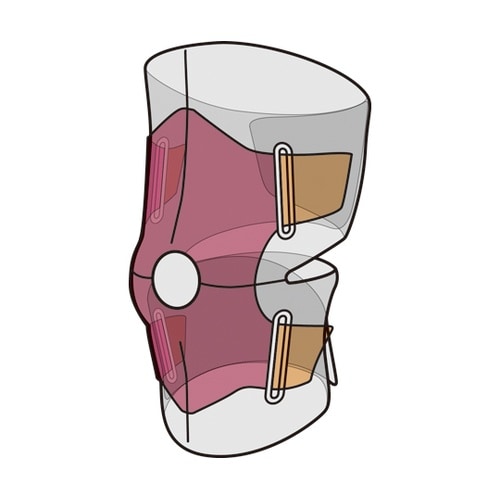 ひざを制御する4方向のストラップを採用。膝蓋骨を包み込む通気性素材の内部シートと4方向の非伸縮ストラップが、効果的な抑えを可能に。屈伸時の妨げにならないひざ裏オープンタイプ。通気性に優れたメッシュ素材 |