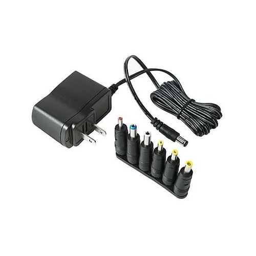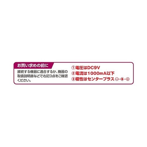 スイッチング式家庭用コンセント(AC100V)をDC9Vの電圧に変換安定化回路内蔵で、電圧変動が少なく機器にやさしい高容量1000mA、様々な機器に対応する6種類の変換プラグ付き |