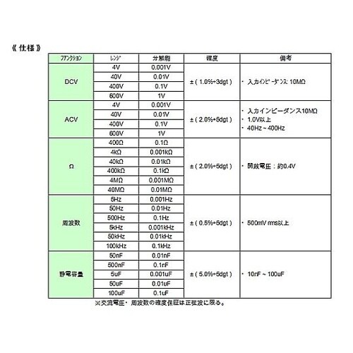 レンジ 4V/40V/400V/600V分解能 0.001V/0.01V/0.1V/1V確度 ±(1.0%+3dgt)入力インピーダンス 10MΩレンジ 4V/40V/400V/600V分解能 0.0 |