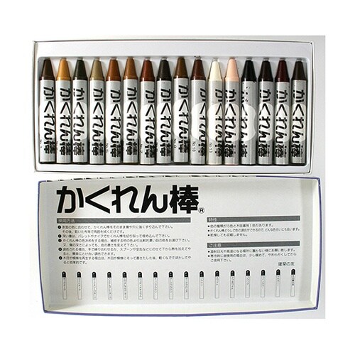 フローリングや木製品の補修に最適!キリキズに直接スり込めるソフトタイプ。簡単に素早く補修が出来ます。かくれん棒どうしで調色ができます。木目書き用や保護液もあります。施工後の収縮・ひび割れは、ほとんどあ |