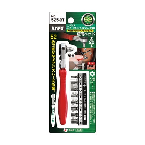 ヘッド幅20mmの超薄型です。52枚ギアの細かい送り角で幅の狭い箇所でもねじ回しが容易にできます。全長19mmの超短ビット採用です。(ボックスと六角H8除く、525−Mは(+)No.2×15mm採用) |