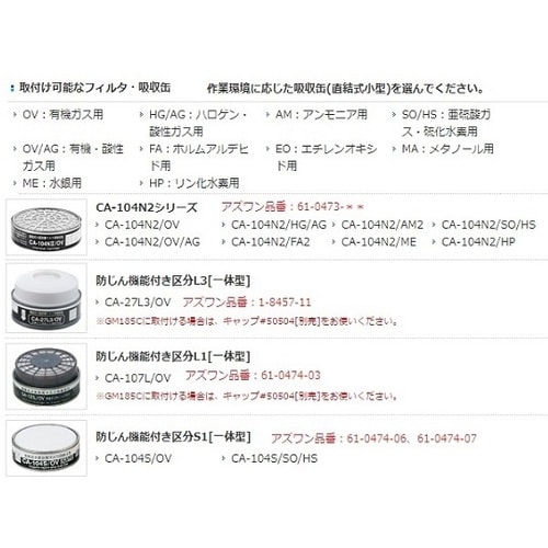 日本人の顔形に合わせた設計で、有害物質の侵入を防ぐダブルクッション構造です。吸収缶の定番CA−104N2シリーズが取付けられるタイプです。低濃度の有毒ガスが発生する作業用。 |