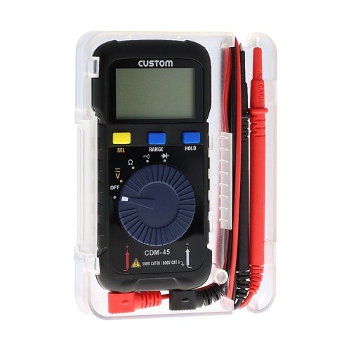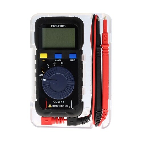 使用頻度の高い機能をまとめたベーシックモデルになります。テストリードは着脱式になり、断線した時は交換ができます。ケース付きで、本体とテストリードを収納して持ち運べます。テストリード、プラスチックケース |