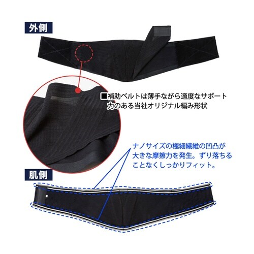 肌着感覚の薄さでしっかりと固定、着衣に響かない軽くてしなやかな生地。着けていることが気にならない薄さで、体の動きへの追従性も抜群です。補助ベルトは薄手ながら適度なサポート力のある当社オリジナル編み形状 |