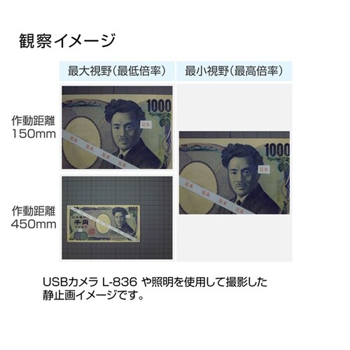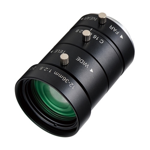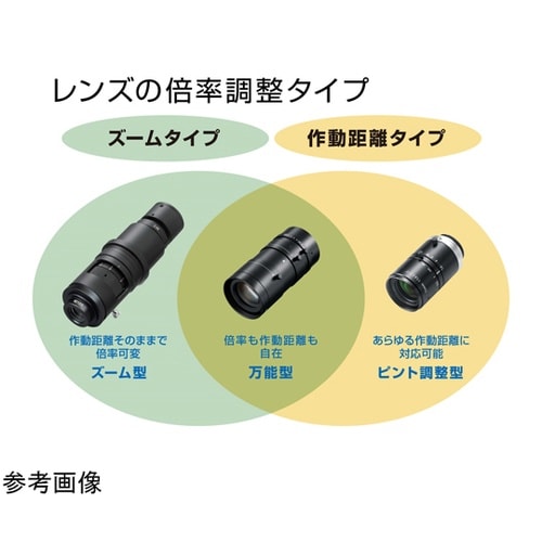 作動距離(12−36mm相当)を自在に調整することができるレンズ(バリフォーカルレンズ)です。また、調整した作動距離を保ったまま視野(倍率)を変更することが可能です。作動距離が長いほど、調整できる視野 |