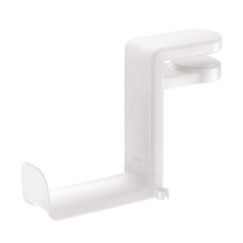 デスクや棚にワンタッチで簡単に設置できるヘッドホンフックです。360度回転式なので机の外向きでも内向きでも使用できます。最大38mmまでの天板にしっかり固定できるバネ式構造を採用しています。 |