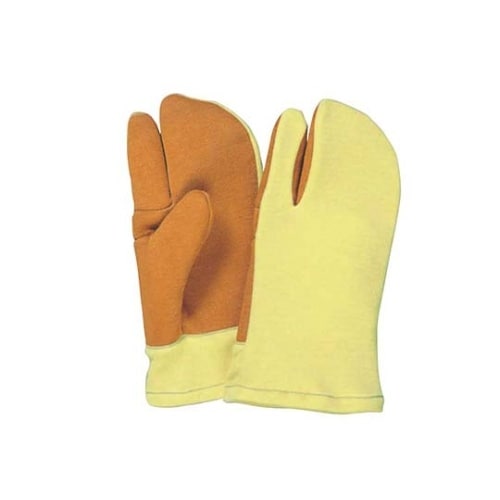 高強力繊維「ザイロン(R)」「ケブラー(R)」を使用し、高耐熱性・高切創性を有しています。手の平部の内側には断熱材として、パラ系アラミド繊維フエルトを使用しています。 |