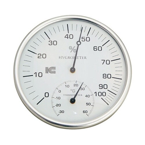 湿度部分が大きく表示された温湿度計です裏面にフック穴とスタンド付き |