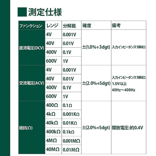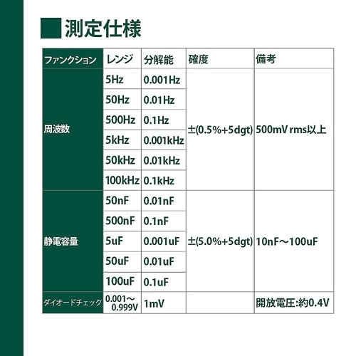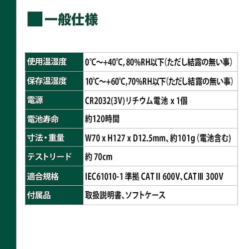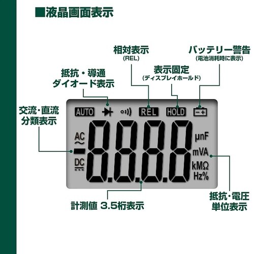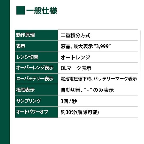背面の内蔵マグネットで本体を固定できます。豊富な測定項目。ディスプレイホールド機能。電池の消耗を防ぐオートパワーオフ機能。導通ブザーとダイオードテストも可能。本体横にテストリード収納可能。 |