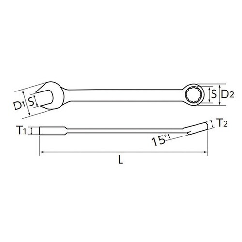 柄は中央にくぼみを持たせ、しなりに強く軽量化も図れる断面形状。サイズ表示は大きく見やすい鍛造浮き出し刻印です。めがね側十二角タイプのコンビネーションレンチです。 |