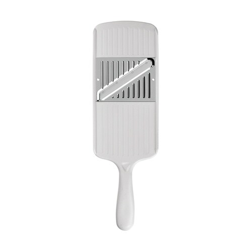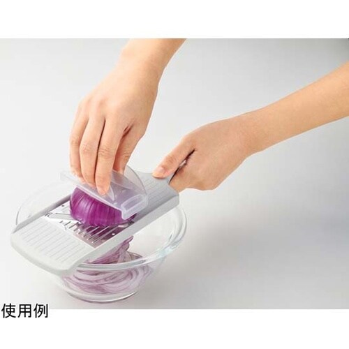 玉ねぎやじゃがいも等のスライスに刃部はステンレス製持ちやすい独自のハンドル形状刃先から指を守るホルダー付ボウルの縁に固定できる溝付き |