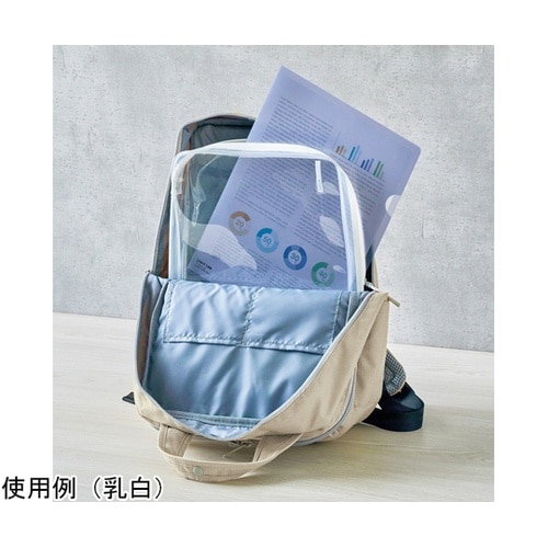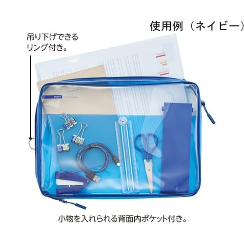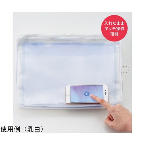 大きく開いて出し入れしやすいクリヤータイプのボックスケース。吊り下げできるリング付き。小物を入れられる背面内ポケット付き。大きく開いて開け閉めしやすいダブルファスナー。スマートフォンを入れたままタッチ |