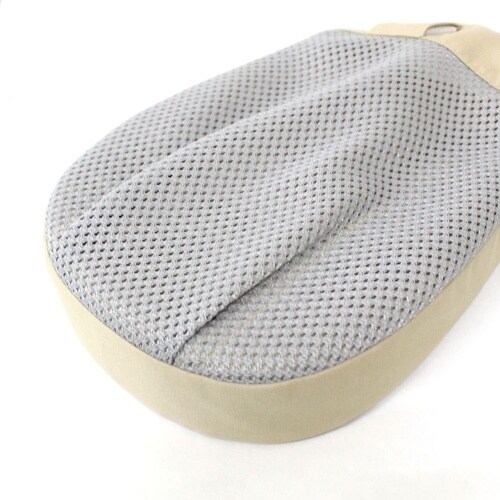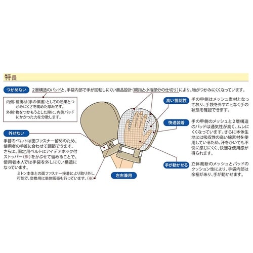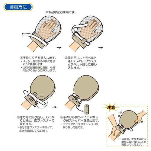 手首ベルトの上からアイデアホック付ストッパーをかぶせて留めるため、使用者本人ではミトンを外しにくい構造です。手の甲側にメッシュ素材を使用しているためムレにくく、ミトンを外さずに手の状態を確認できます。 |