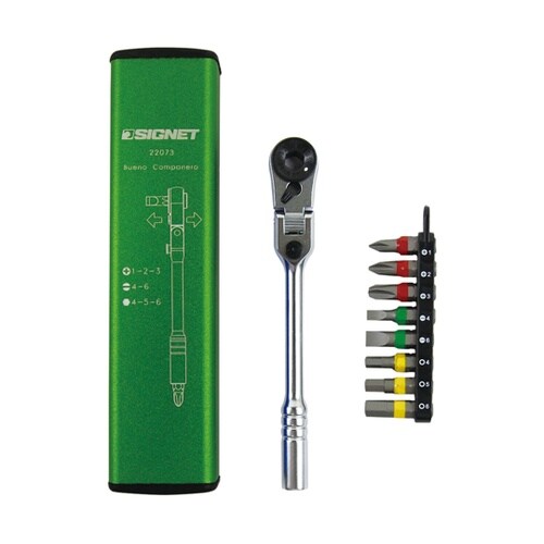 フレックスラチェットタイプ。カラフルなアルミケース付き。DIYや自転車の車載工具、自動車バイクの細かいパーツの脱着に最適。首振り式のヘッドで、プッシュボタンで13段階の角度でロック、最大90度。切替式 |