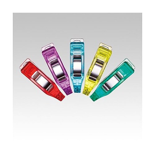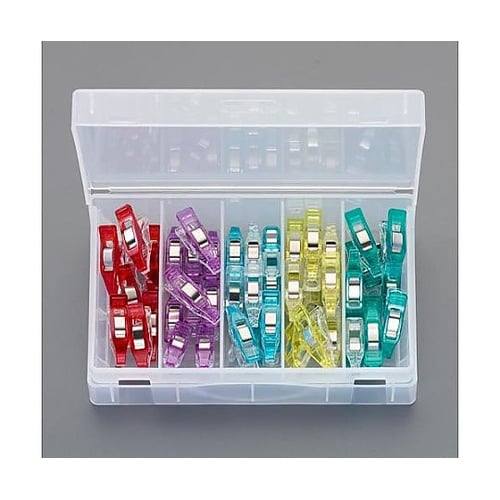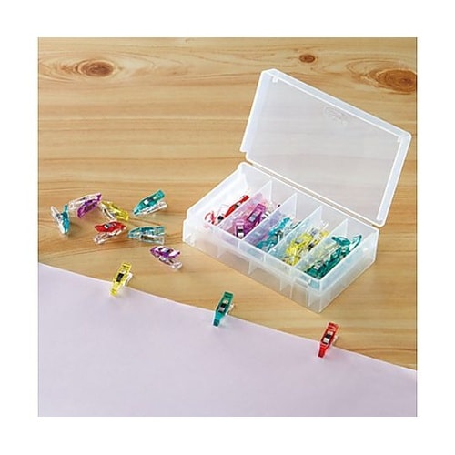 ピンポイントで止める先細タイプです。使い分けに便利な5色入です。5・7・10mmのぬいしろ幅の目安を測れる目盛付です。普通地・薄地もピンポイントではさめる「ミニ」タイプは、曲線の仮止めにも活躍します。 |