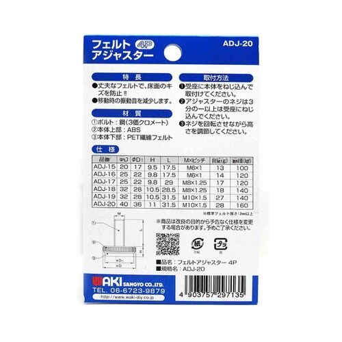 和気産業 フェルトアジャスター M10×1.5 φ40mm 4個入 ADJ−20 A04H-1422