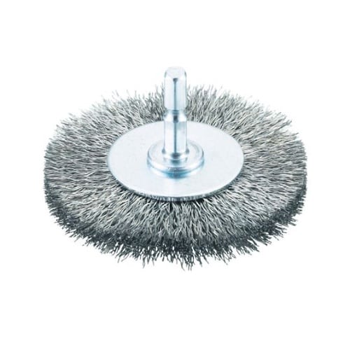 六角軸付のホイール(円盤型)ブラシブラシ形状が円盤型で、外側に向かって放射状に毛が植わっています。ステンレス線なので金属面などにサビが出にくいです。金属面などのバリ取り、研磨、洗浄など。 |