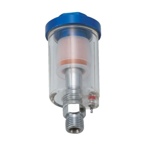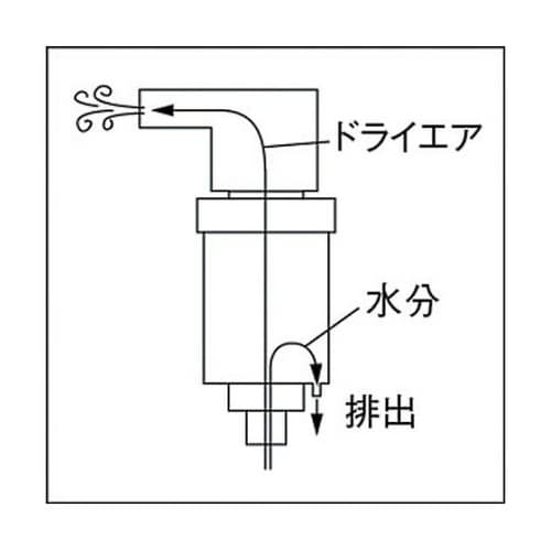手元で簡単にエアホース内の水分、油分などを除去します。本体材質はポリカーボネート製です。水抜きプッシュ弁付です。水、ドレンの溜まりがひと目でわかります。エアツールの入口に取り付け水分の除去。 |