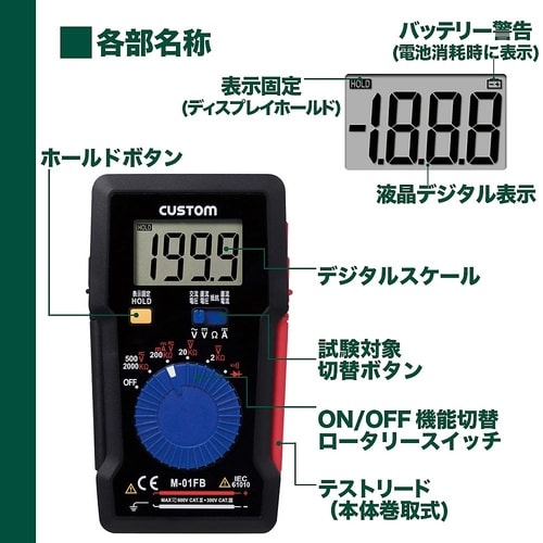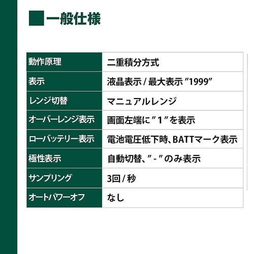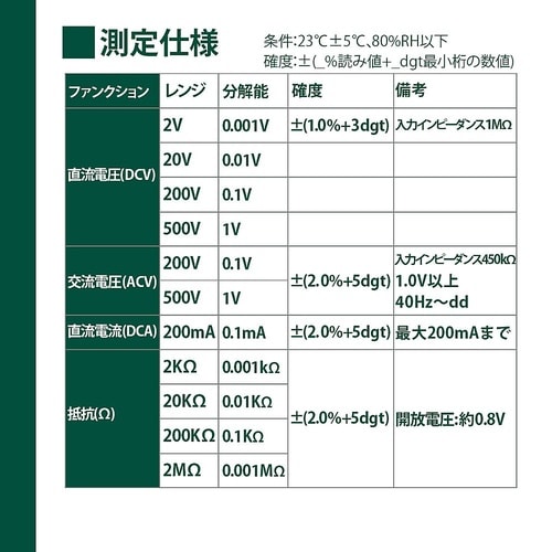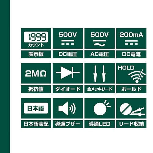 携帯に便利なコンパクトサイズ。本体横にテストリード収納可能。ディスプレイホールド機能。導通ブザーとダイオードテストも可能。 |