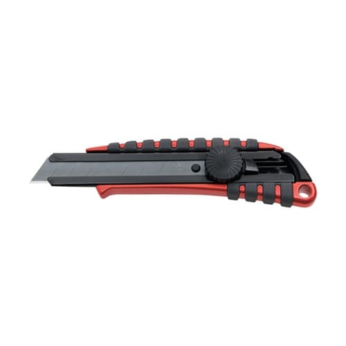 ゴム製グリップが付いた金属タイプなので軍手をはめたままでも滑らず作業できます。強靭なアルミダイキャスト製ボディに鮮烈なメタリックレッド塗装。黒刃標準搭載です。ねじロック式です。厚物切り作業用。 |