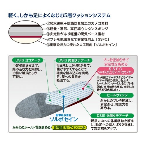 DSIS(ダイナミック シュー インソールシステム)機能で、3つのアーチを支えて足本来の機能を高め、SSFC(ソルボ スタビリティ フット カウンター)機能、内、外側のアーチスタビライザーでアーチ部の |
